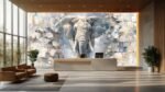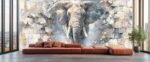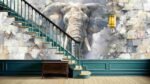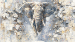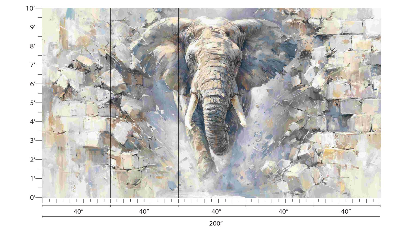 An elephant is depicted bursting through a crumbling wall in a dynamic, artistic style.