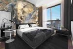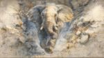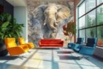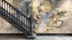 A realistic mural of an elephant breaking through a wall, surrounded by debris.