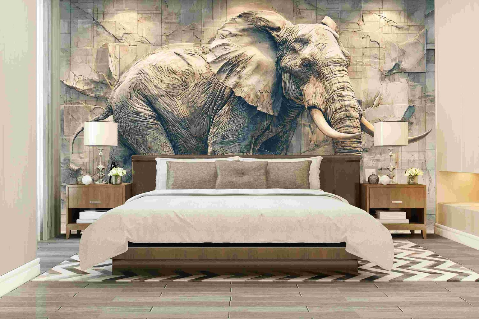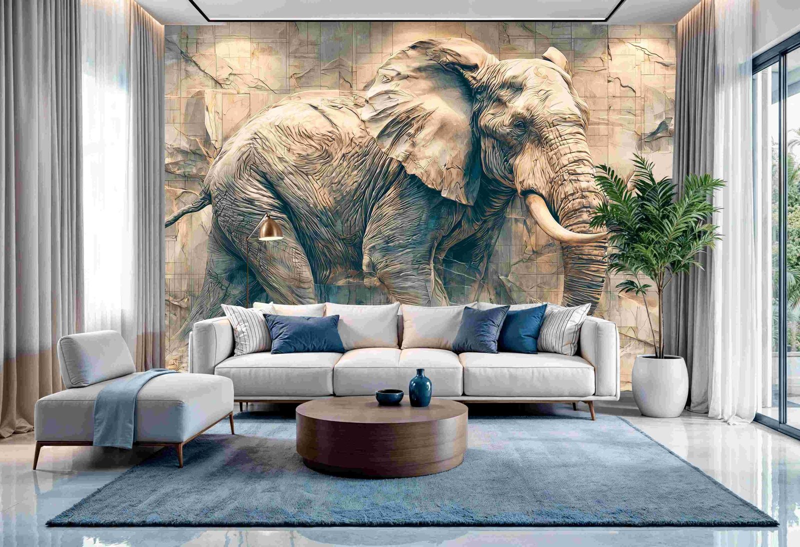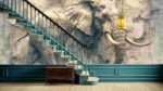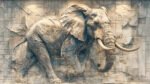 A detailed elephant sculpture emerging from a textured wall, showcasing intricate carvings and lifelike features.