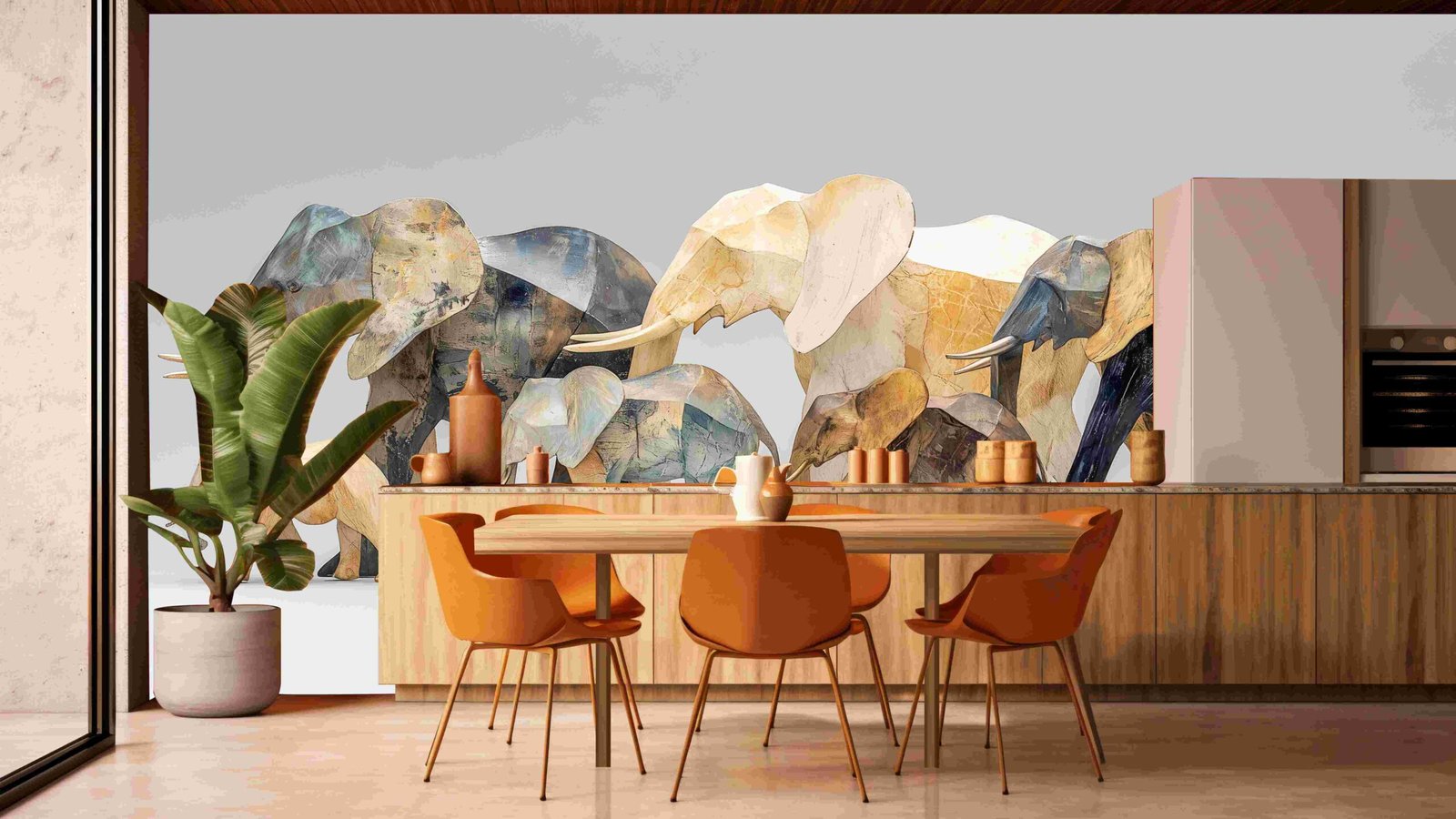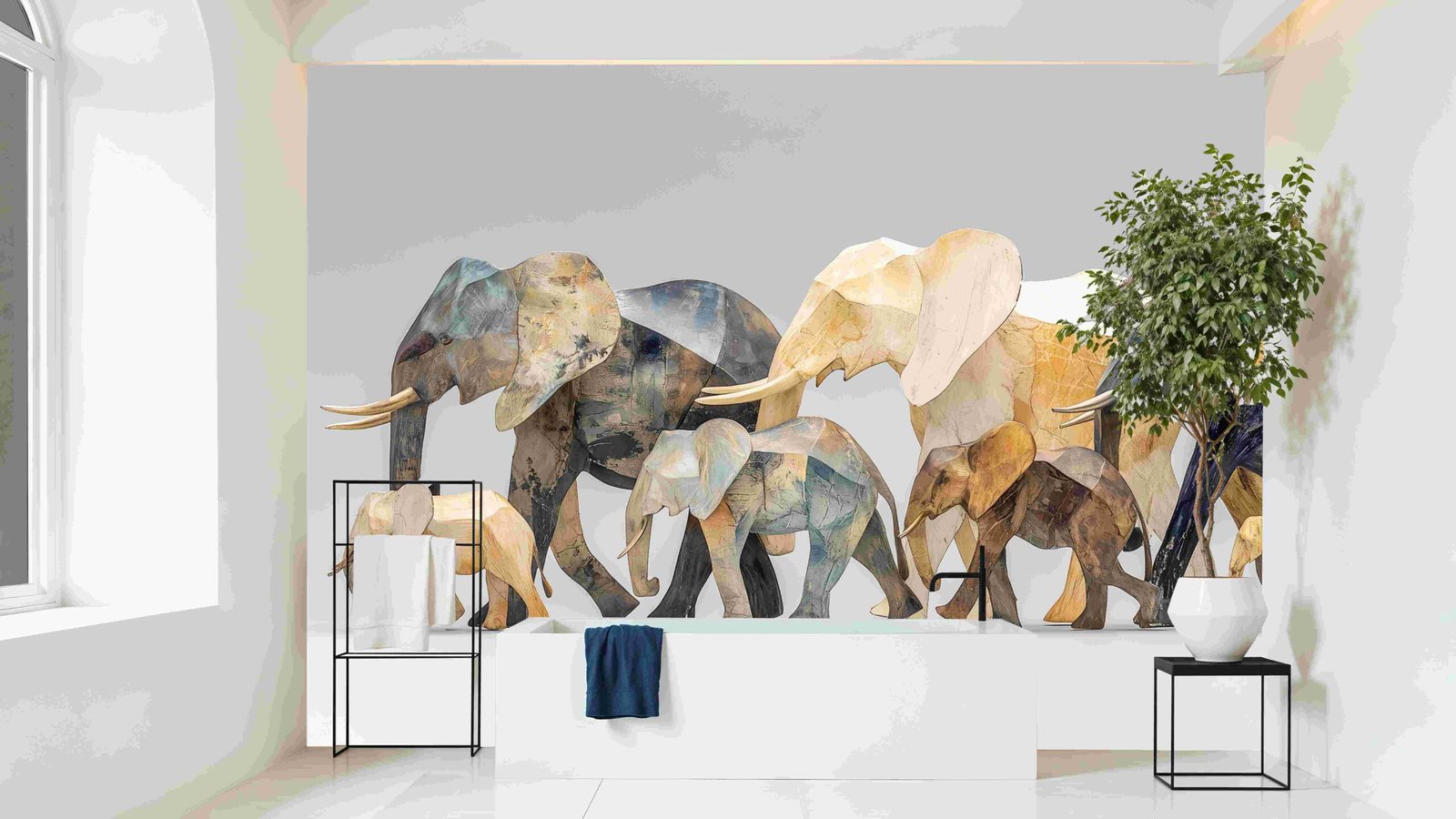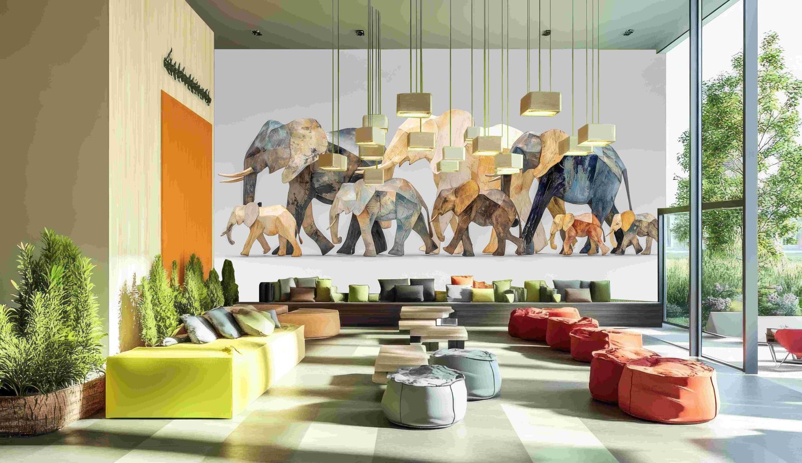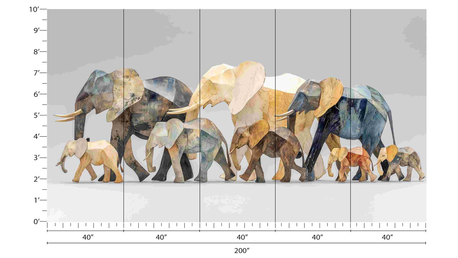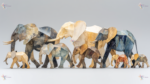 A group of colorful, geometric elephant sculptures in various sizes, arranged in a line.