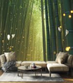 A magical bamboo forest illuminated by countless twinkling lights, creating an enchanting, dreamlike atmosphere under a canopy of lush green leaves.