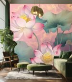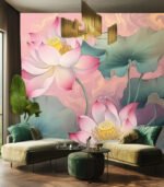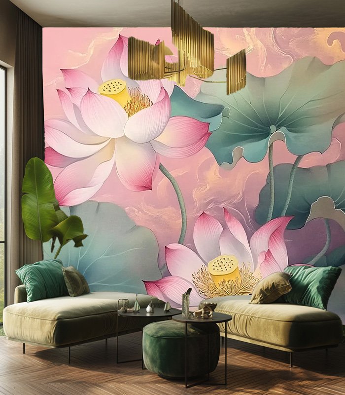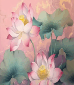 Delicate pink lotus flowers and lush green leaves set against a dreamy, pastel background, creating a serene and ethereal atmosphere.