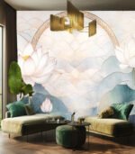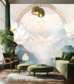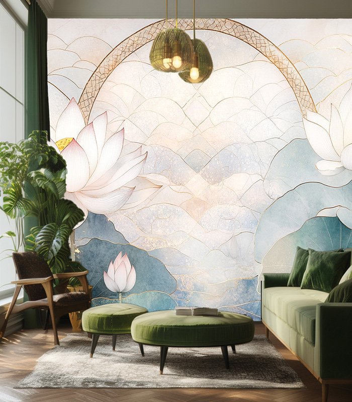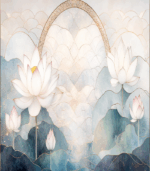 Delicate lotus flowers bloom amidst serene blue and gold hues, creating a tranquil and ethereal atmosphere in this elegant artwork.
