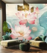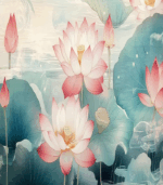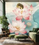 Delicate pink lotus flowers bloom gracefully amidst serene green leaves, creating a tranquil and ethereal aquatic scene with soft, flowing watercolors.