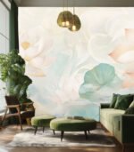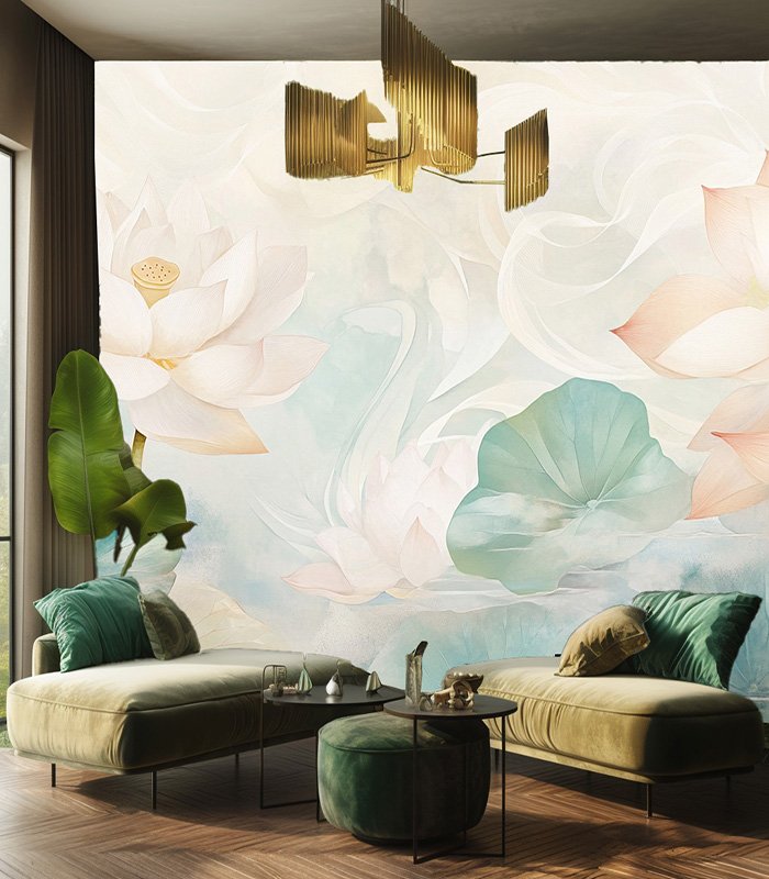 Delicate watercolor painting of lotus flowers and leaves, blending soft pastels and ethereal swirls, creating a serene and tranquil atmosphere.