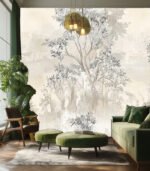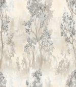 Vintage floral wallpaper with vertical stripes in soft pink, beige, and green hues, featuring delicate flower motifs and intricate border patterns.