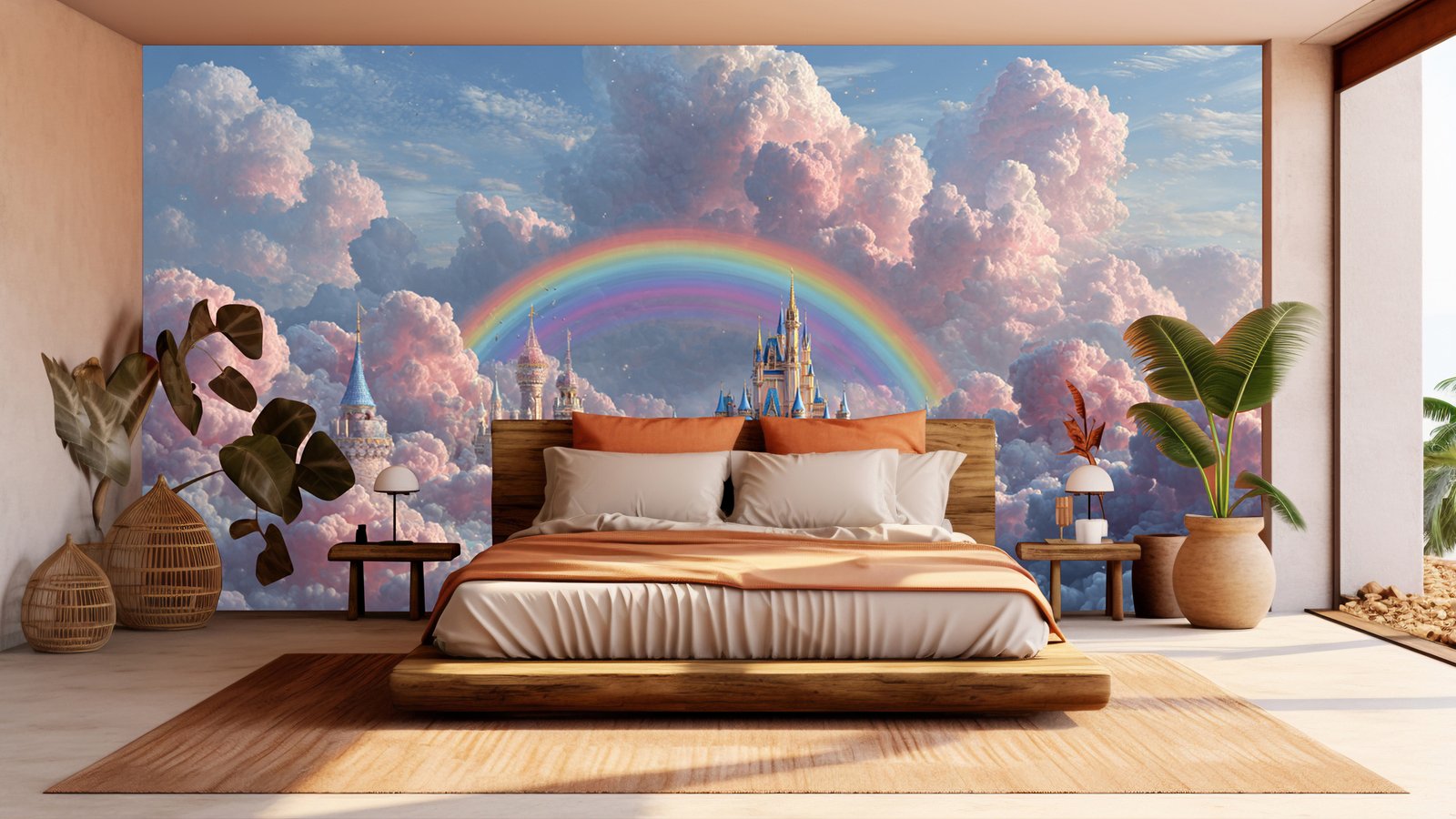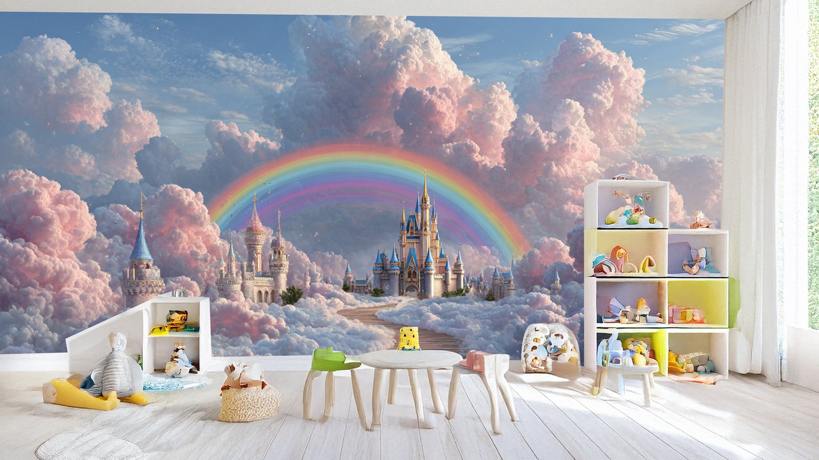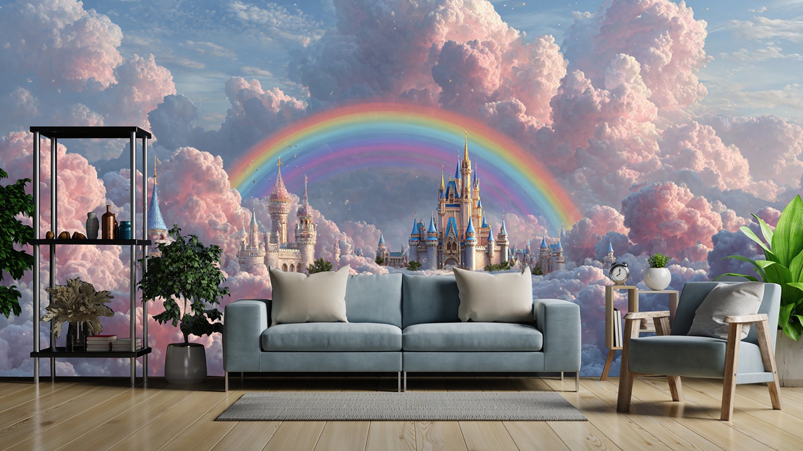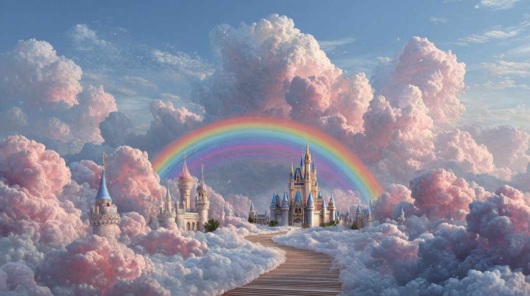 A whimsical castle surrounded by colorful clouds and a rainbow in a dreamy sky.
