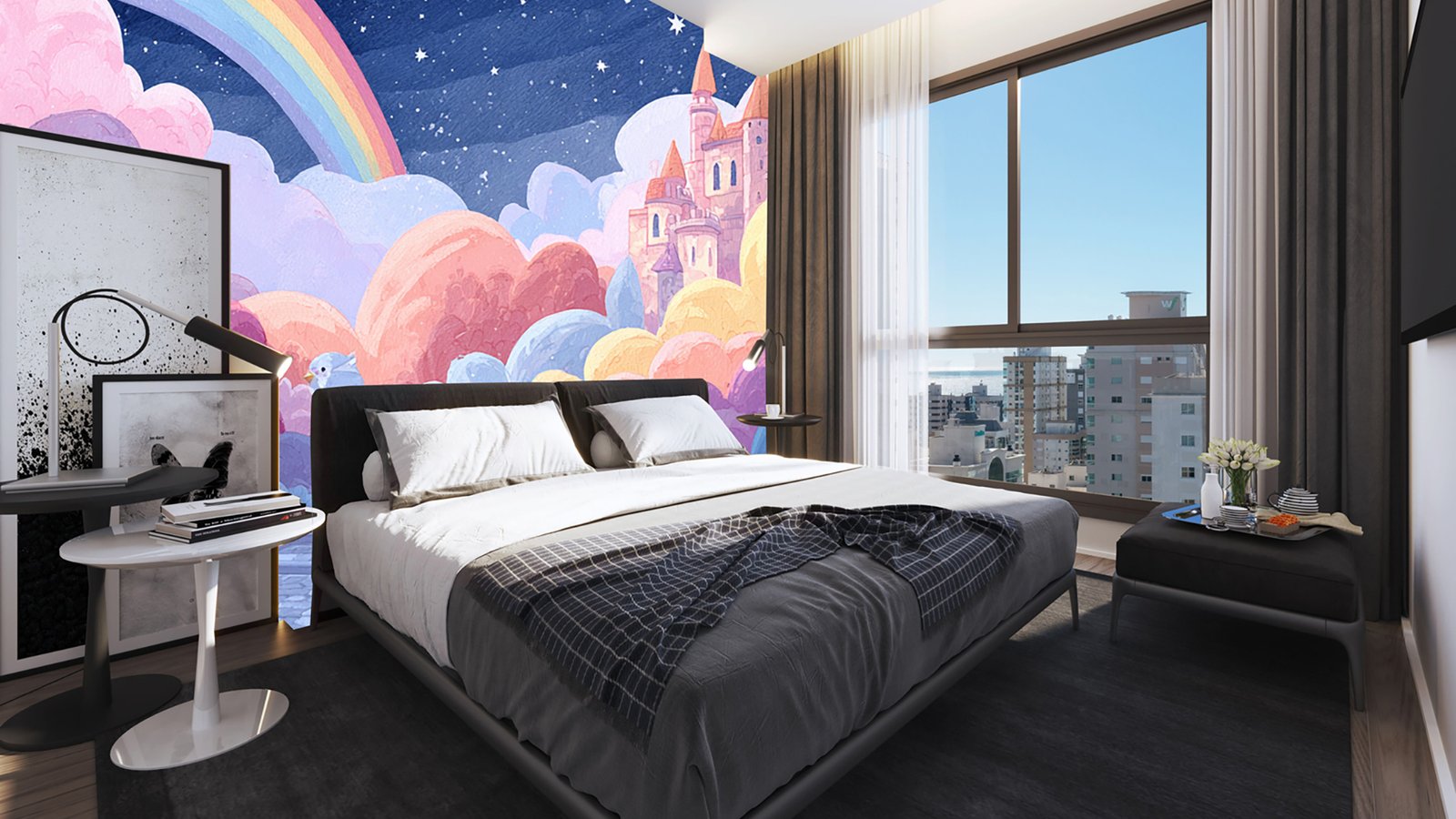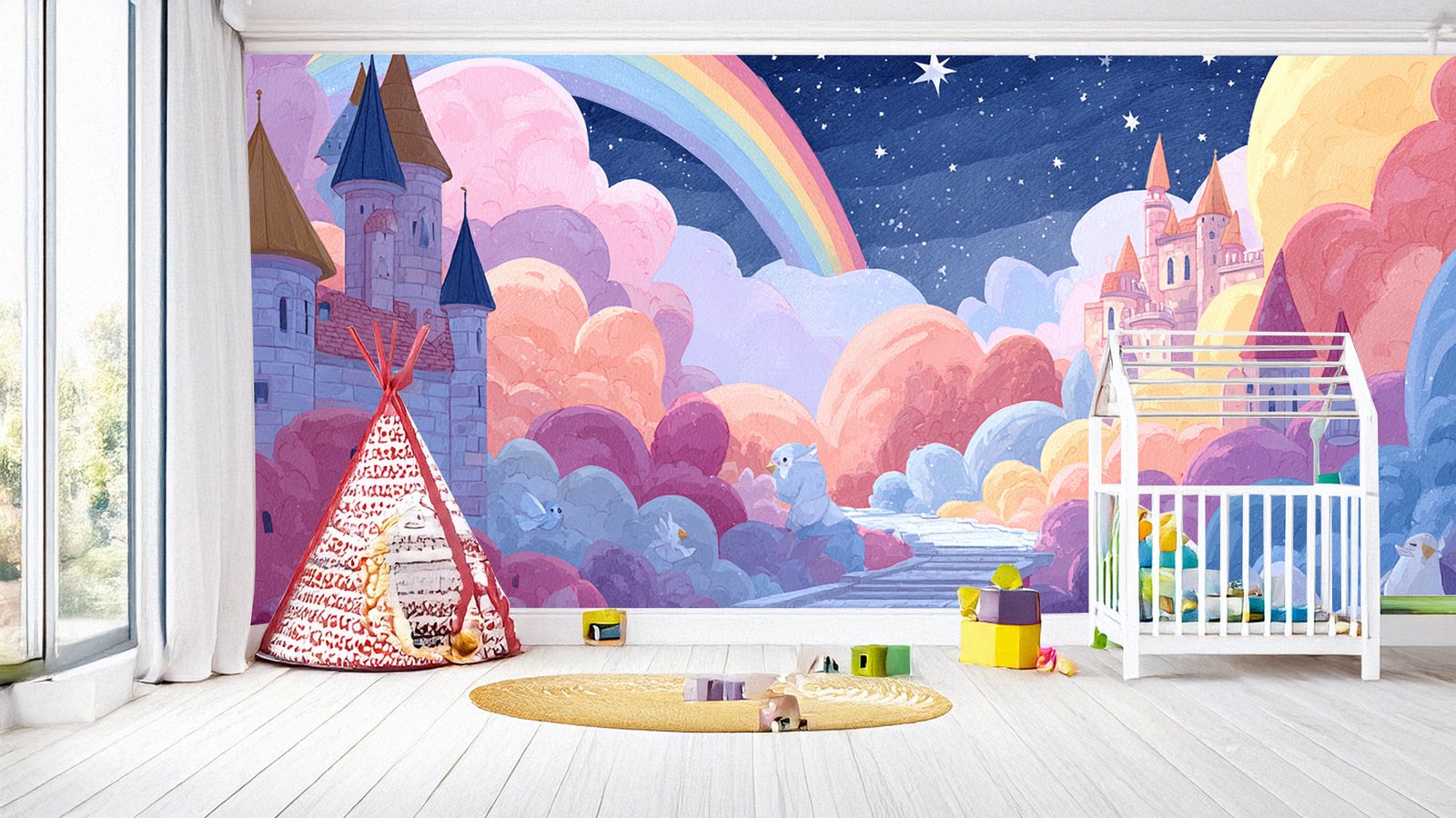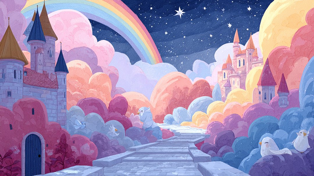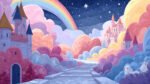 Colorful clouds, castles, a rainbow, and a pathway create a whimsical scene.
