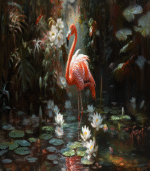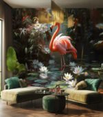 A vibrant flamingo stands gracefully among blooming water lilies in a lush, serene pond, surrounded by rich, verdant foliage and soft, dappled light.