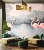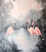 Three pink flamingos gracefully stroll by a serene lake, surrounded by lush foliage and distant mountains, in a tranquil, monochromatic landscape.