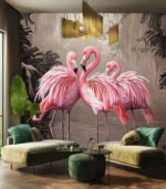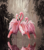 Three elegant flamingos stand gracefully in a serene, lush setting, their vibrant pink feathers beautifully reflected in the tranquil water below.