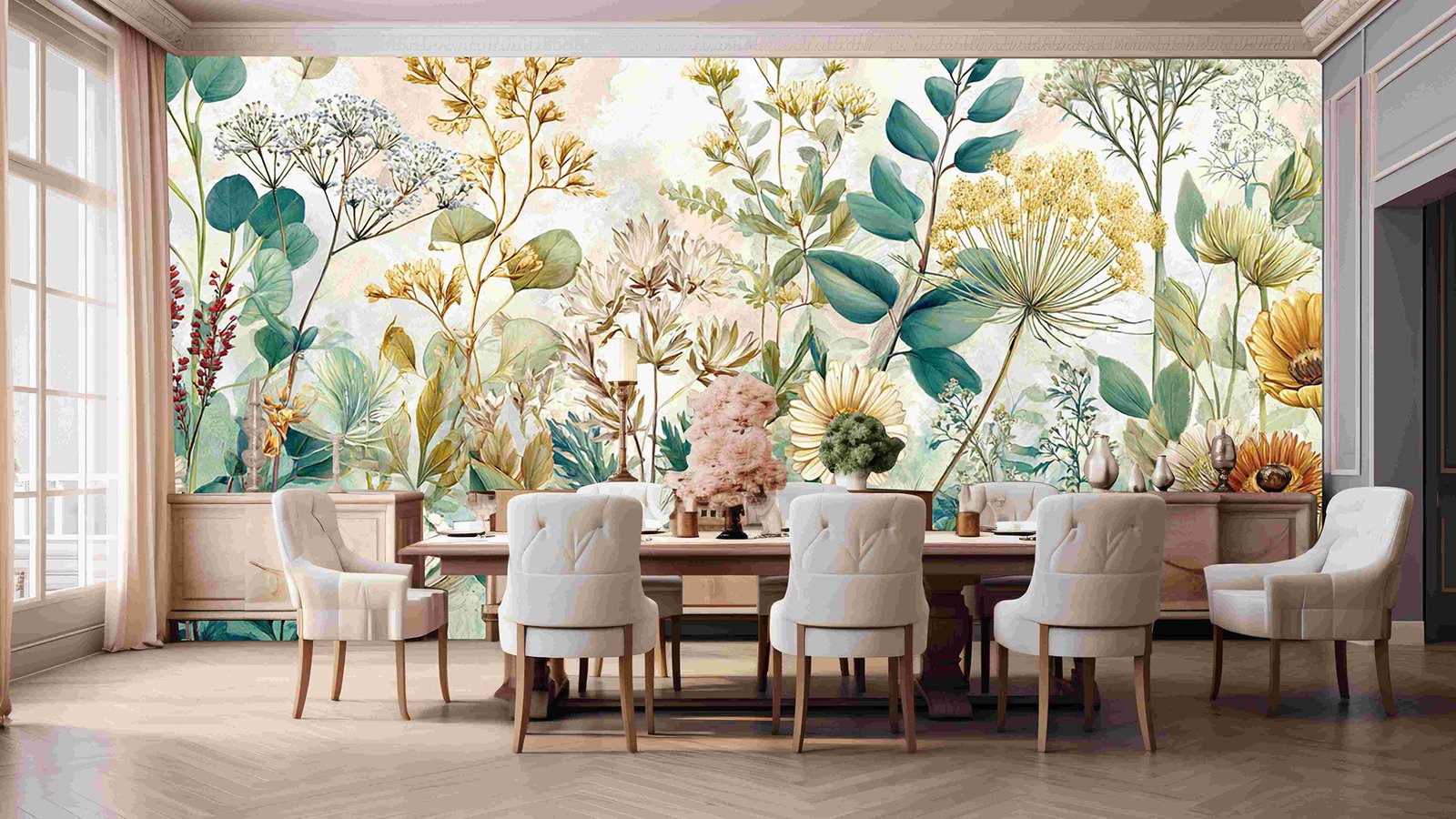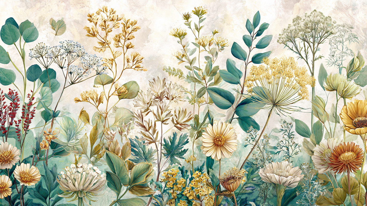 A vibrant collection of various flowers and leaves in soft pastel tones, showcasing intricate details and diverse shapes.