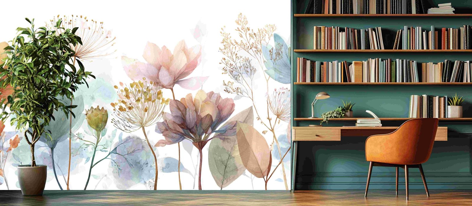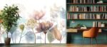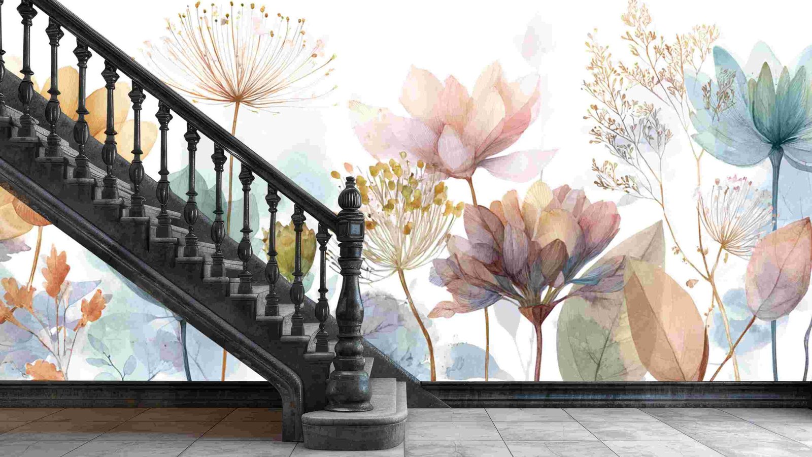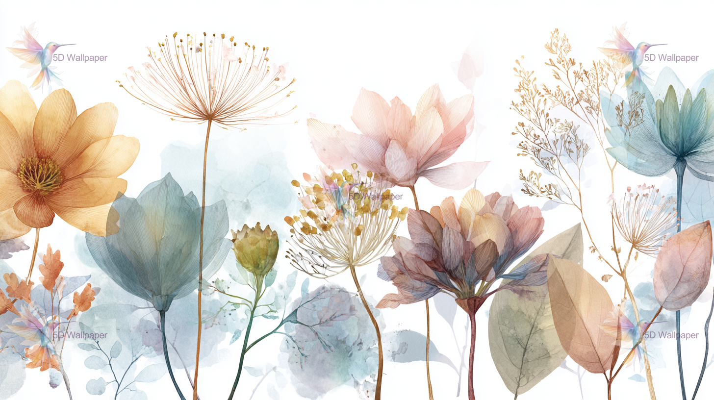 A collection of various pastel-colored flowers and leaves with delicate details and soft watercolor effects.