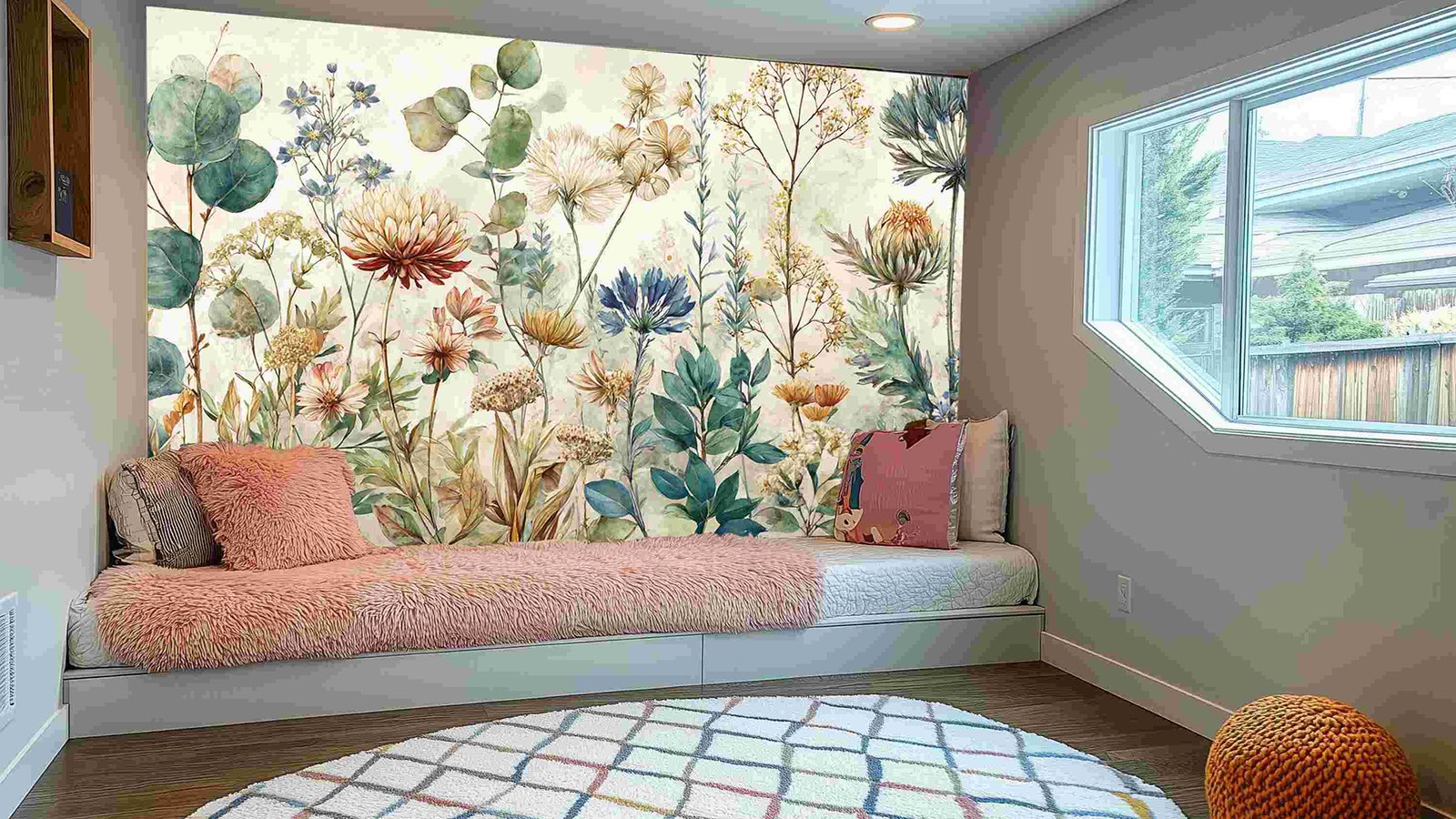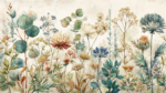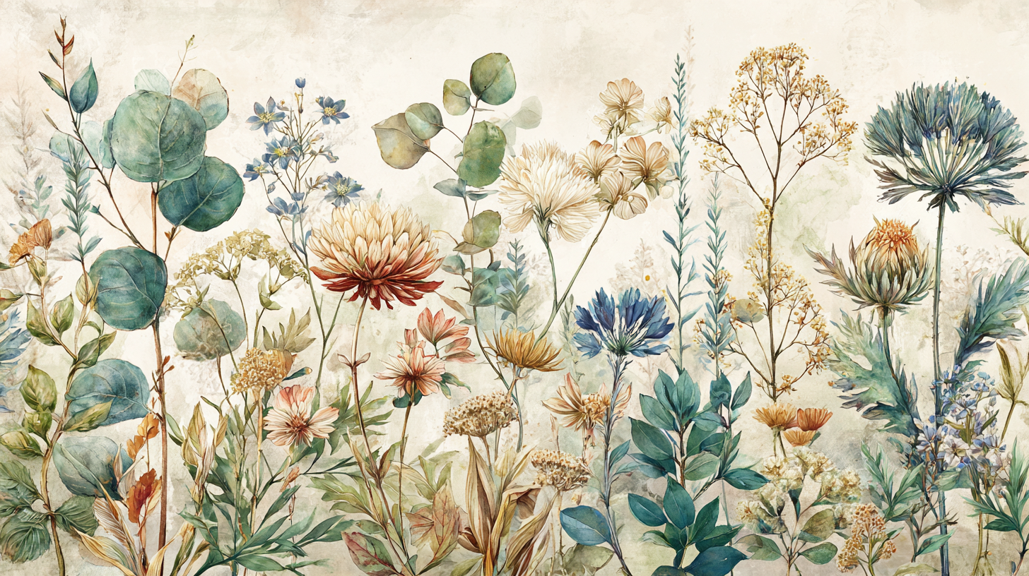 A variety of colorful flowers and leaves illustrated in a soft watercolor style, showcasing diverse shapes and hues.