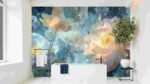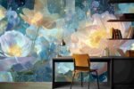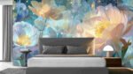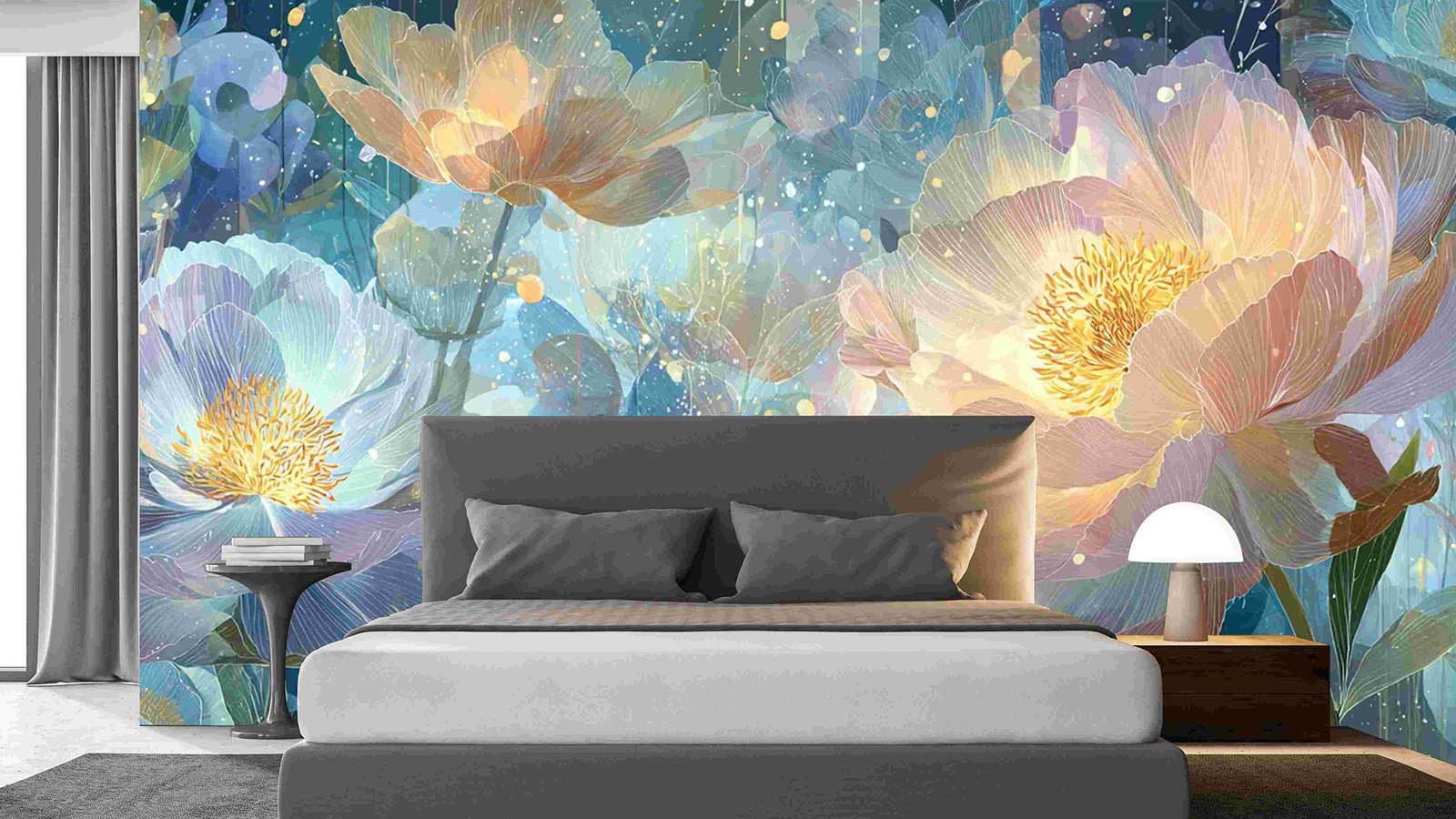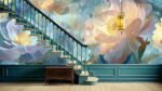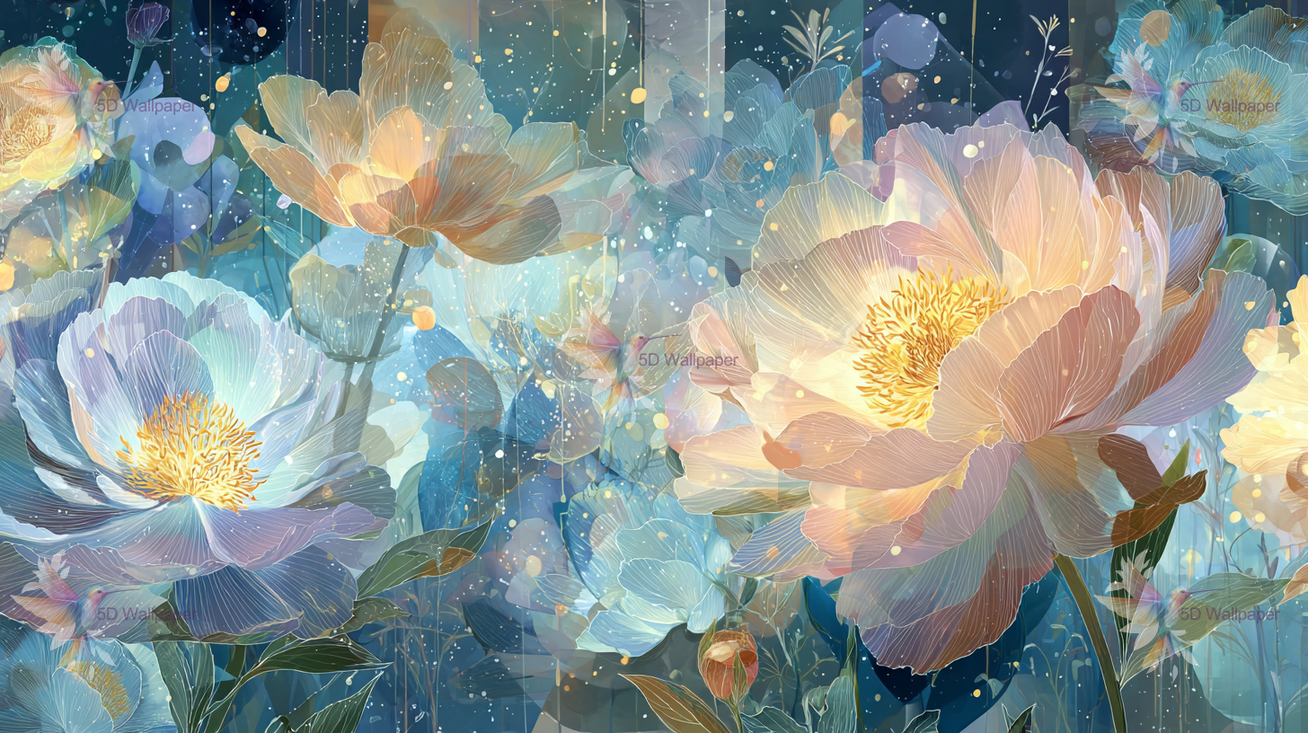 A vibrant illustration of large, pastel-colored flowers with intricate details against a blue background.