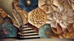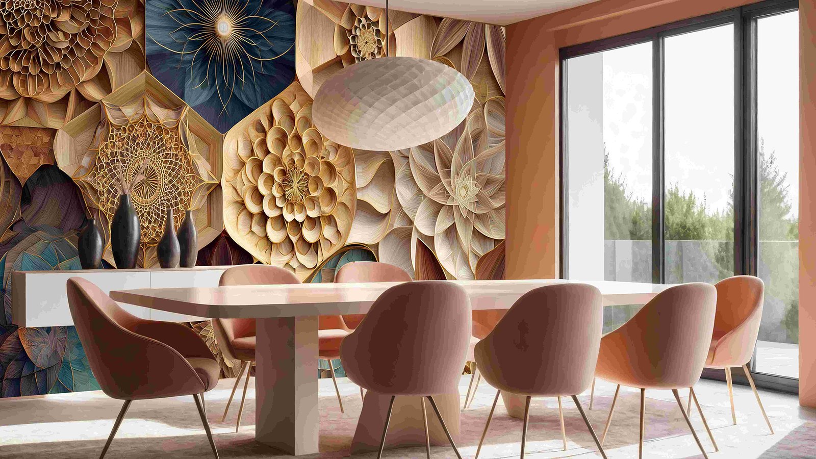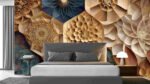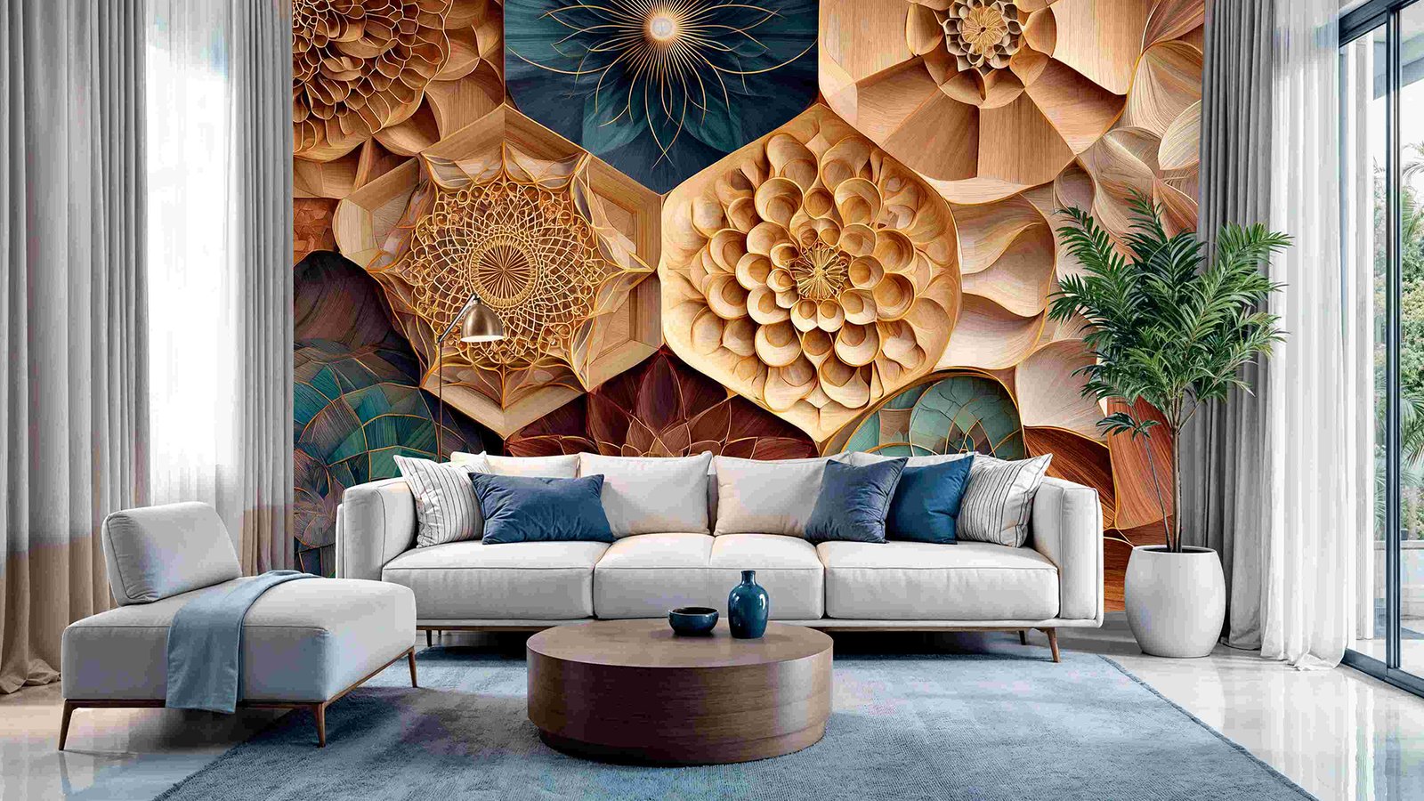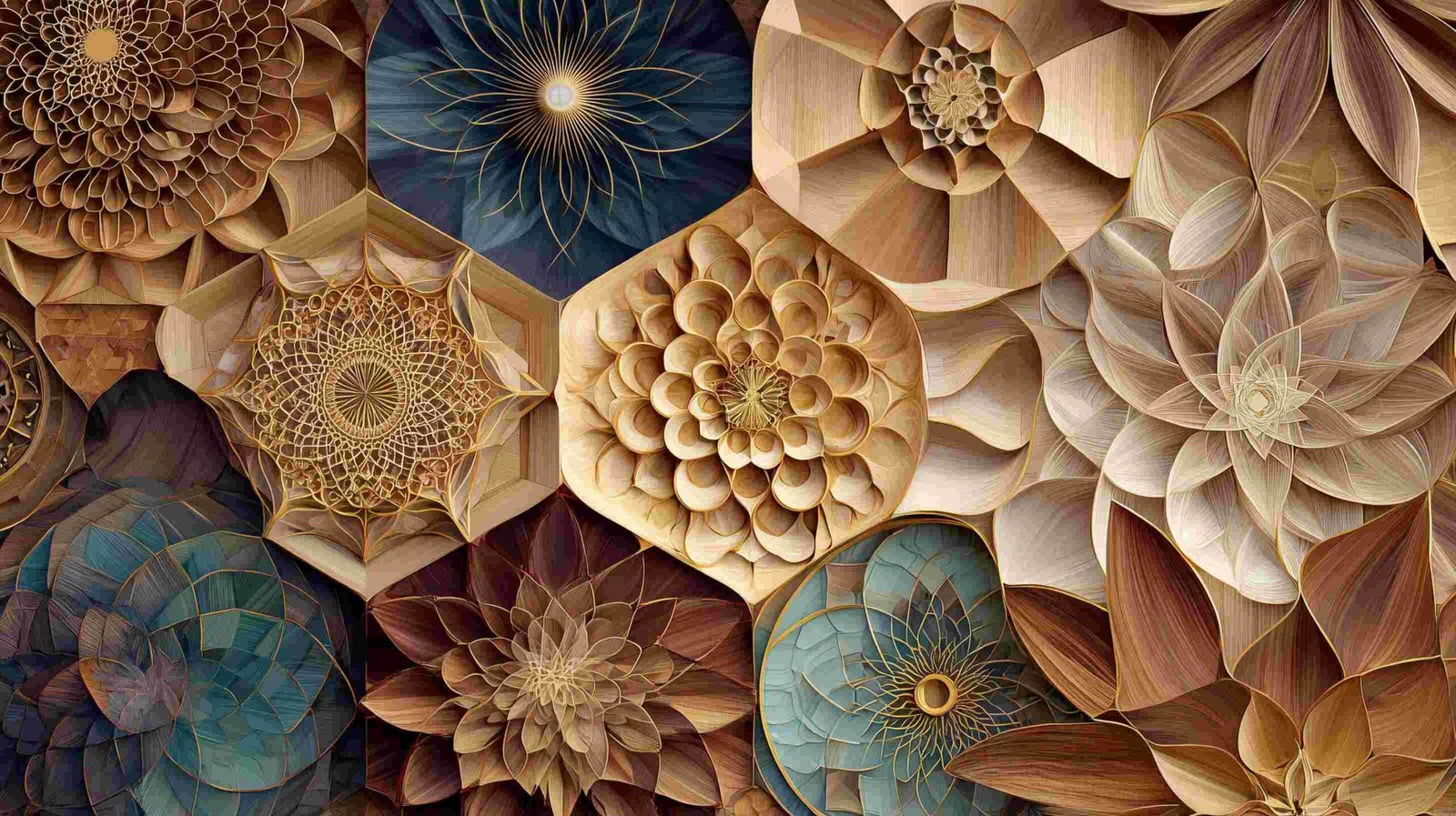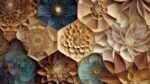 A collection of intricate floral designs in various shades of brown and blue, arranged in a hexagonal pattern.
