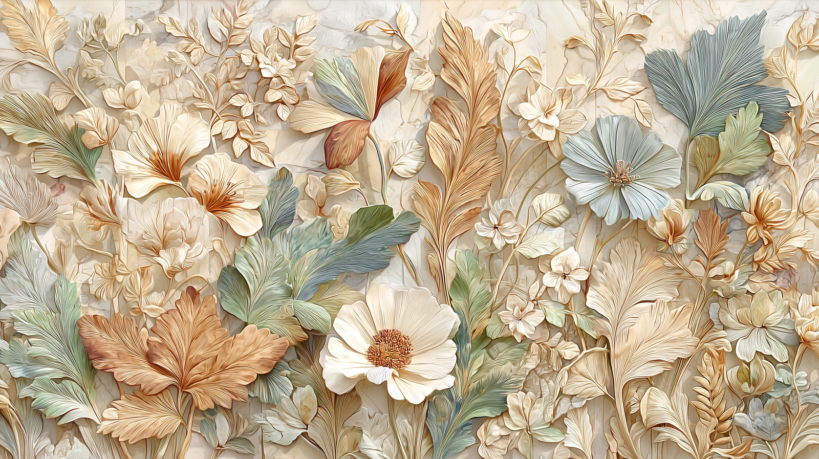 A textured arrangement of various flowers and leaves in soft pastel colors.