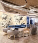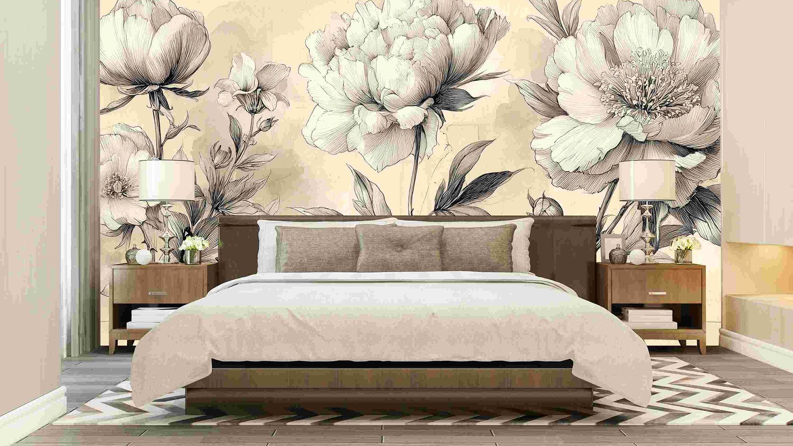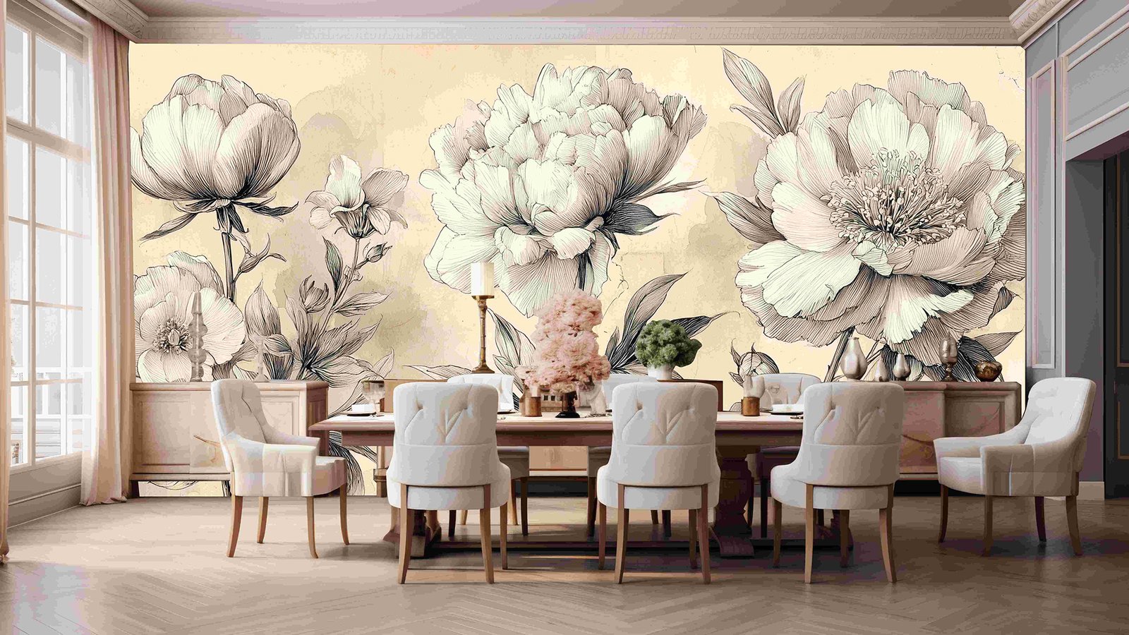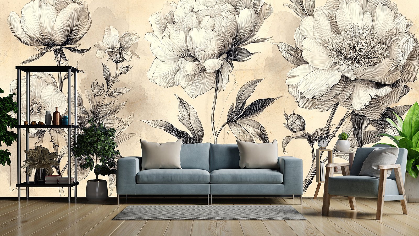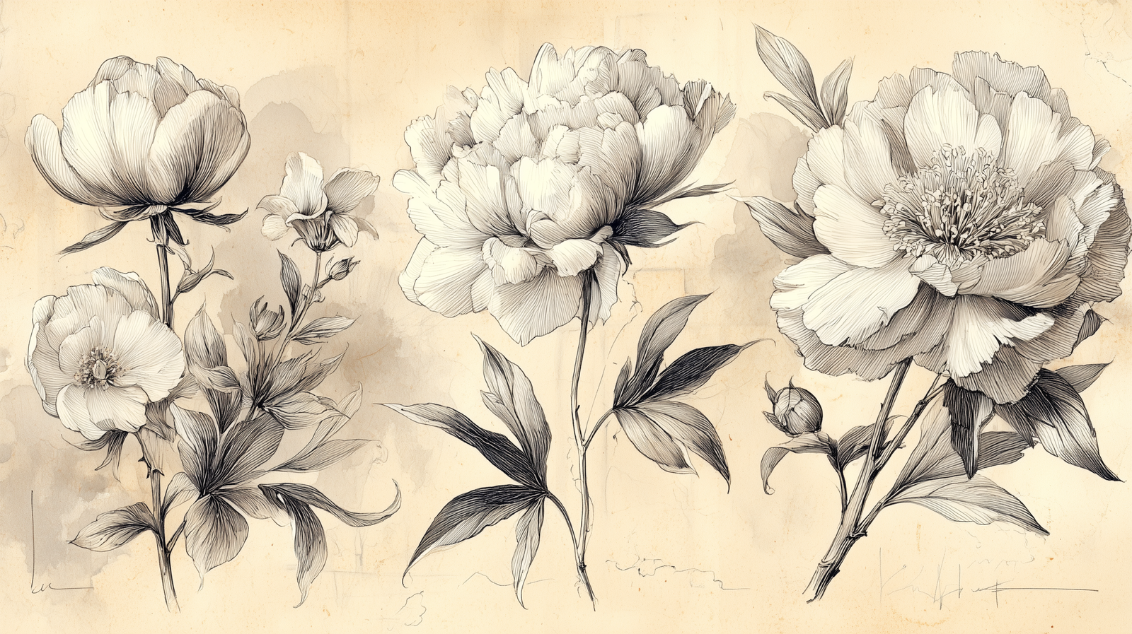 Three detailed peony flowers with intricate line work on a textured beige background.