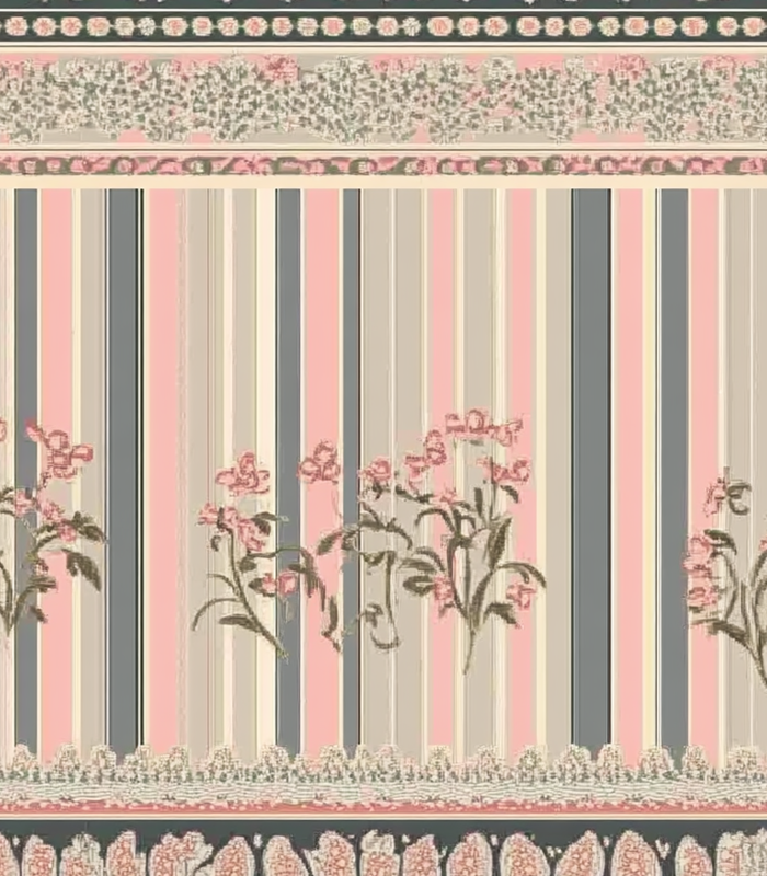 Vintage floral wallpaper with vertical stripes in soft pink, beige, and green hues, featuring delicate flower motifs and intricate border patterns.