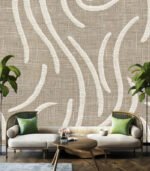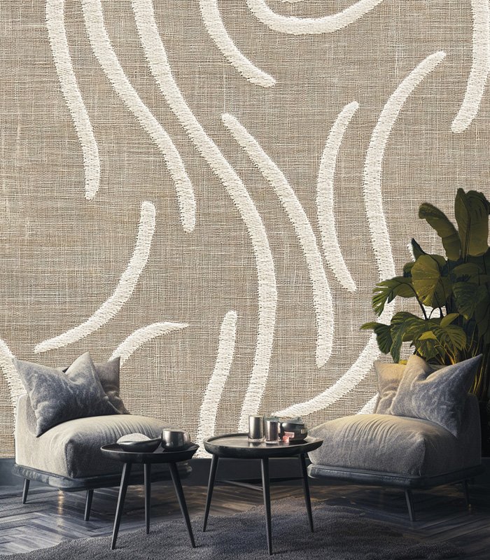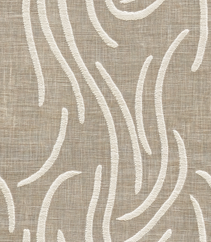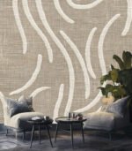 Abstract beige fabric with wavy, textured white lines creating a flowing pattern. The design evokes a sense of movement and natural elegance.