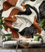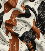 Abstract fabric design with flowing black, brown, and white shapes, featuring delicate line patterns and organic forms, creating a dynamic and artistic visual effect.