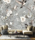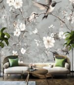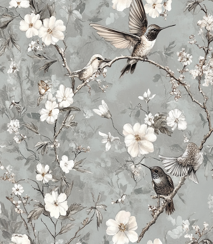 Delicate hummingbirds and butterflies flutter among blooming branches, creating a serene and elegant nature scene on a soft, muted background.