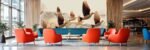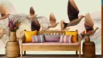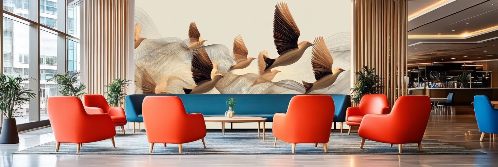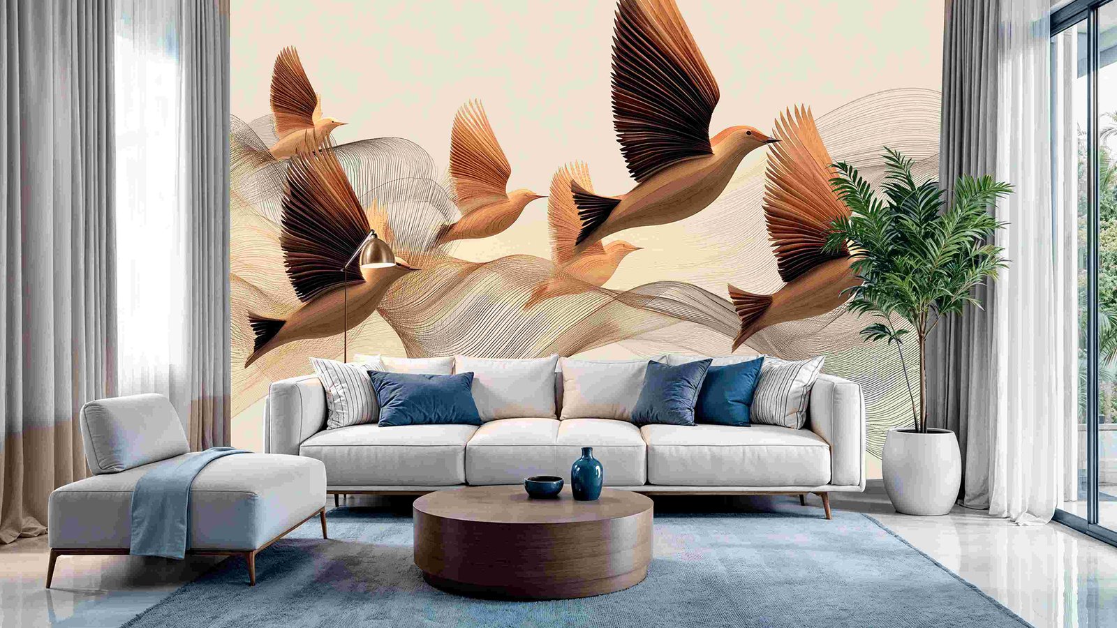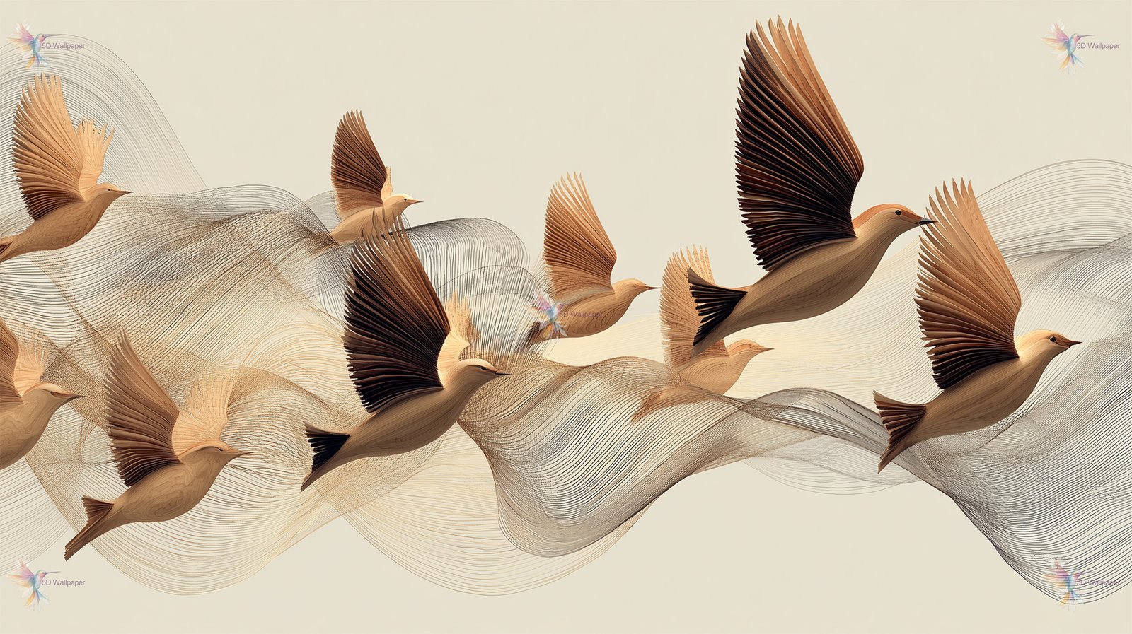 Stylized birds in flight with flowing lines on a neutral background.