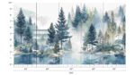 Misty forest with pine trees, a lake, and a modern building in the background.