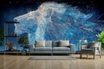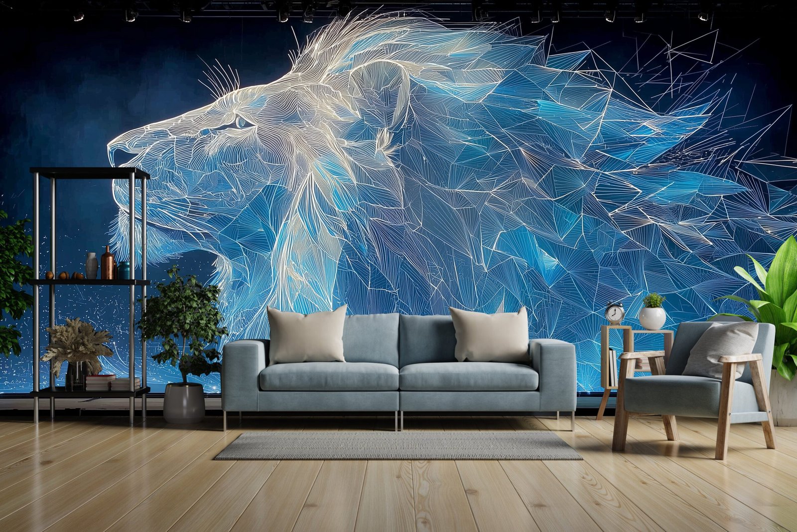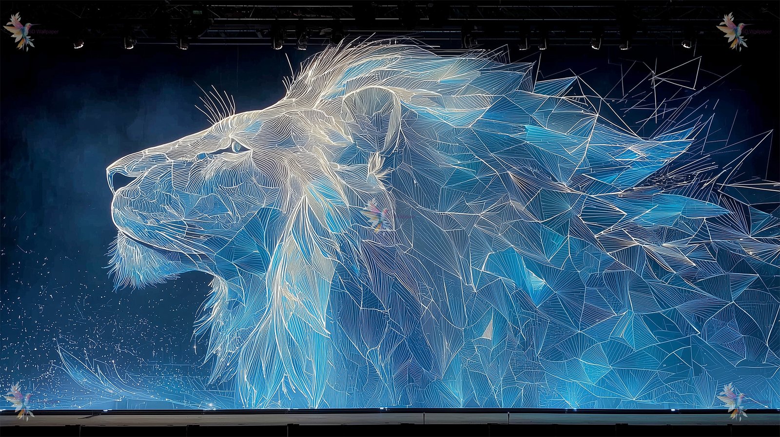 Abstract geometric depiction of a lion in blue and white tones on a dark background.