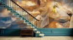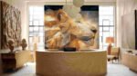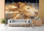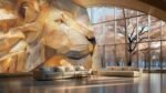 A large, intricate geometric sculpture of a lion’s head with angular patterns and warm lighting.