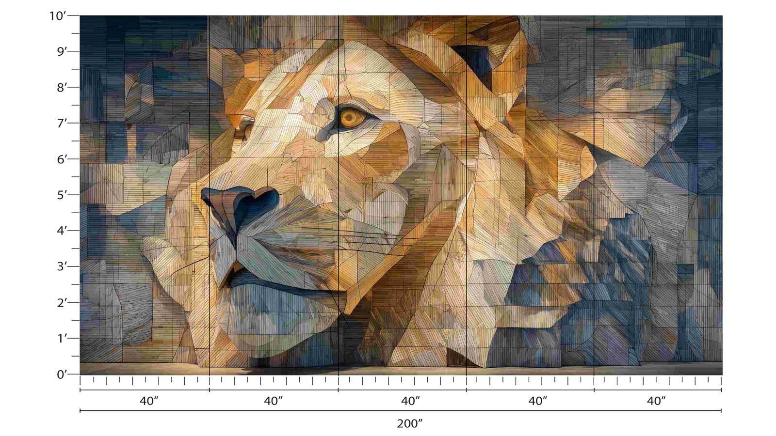 A stylized geometric depiction of a lion’s face with intricate patterns and shading.