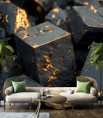 Golden veins illuminate the rugged surfaces of dark, geometrically cut stones, creating a striking contrast that highlights nature’s intricate artistry and raw beauty.