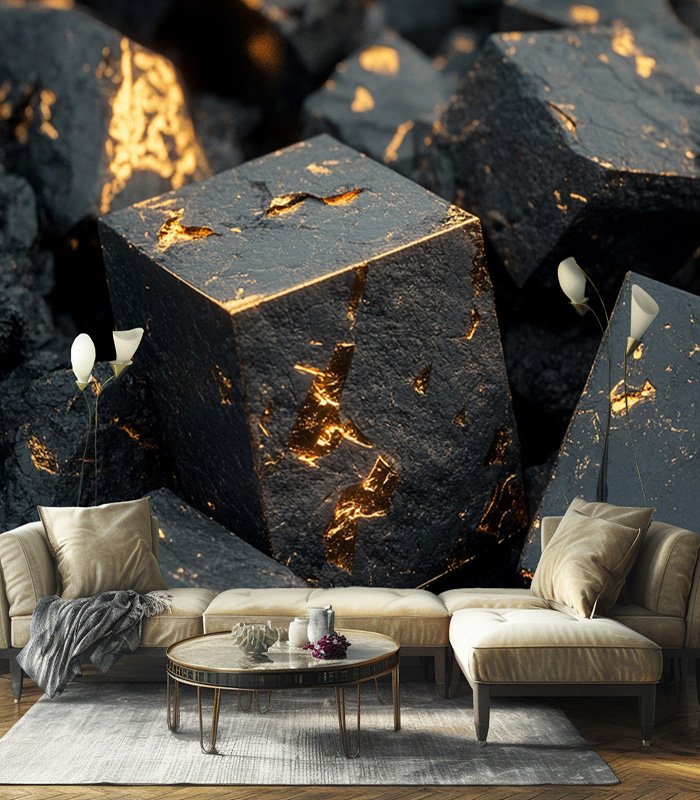 Golden veins illuminate the rugged surfaces of dark, geometrically cut stones, creating a striking contrast that highlights nature’s intricate artistry and raw beauty.