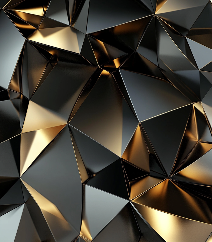 Abstract geometric background featuring a complex arrangement of polygonal shapes in shades of black and gold, creating a luxurious and modern 3D texture.