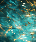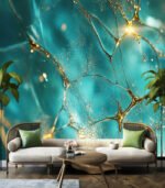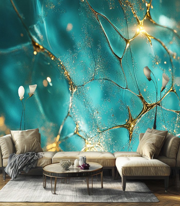 A mesmerizing close-up of golden veins intricately weaving through a vibrant turquoise backdrop, creating a luminous and ethereal abstract art piece.