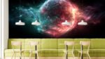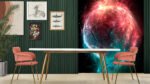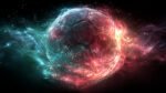 A vibrant soccer ball surrounded by colorful cosmic effects and swirling light patterns