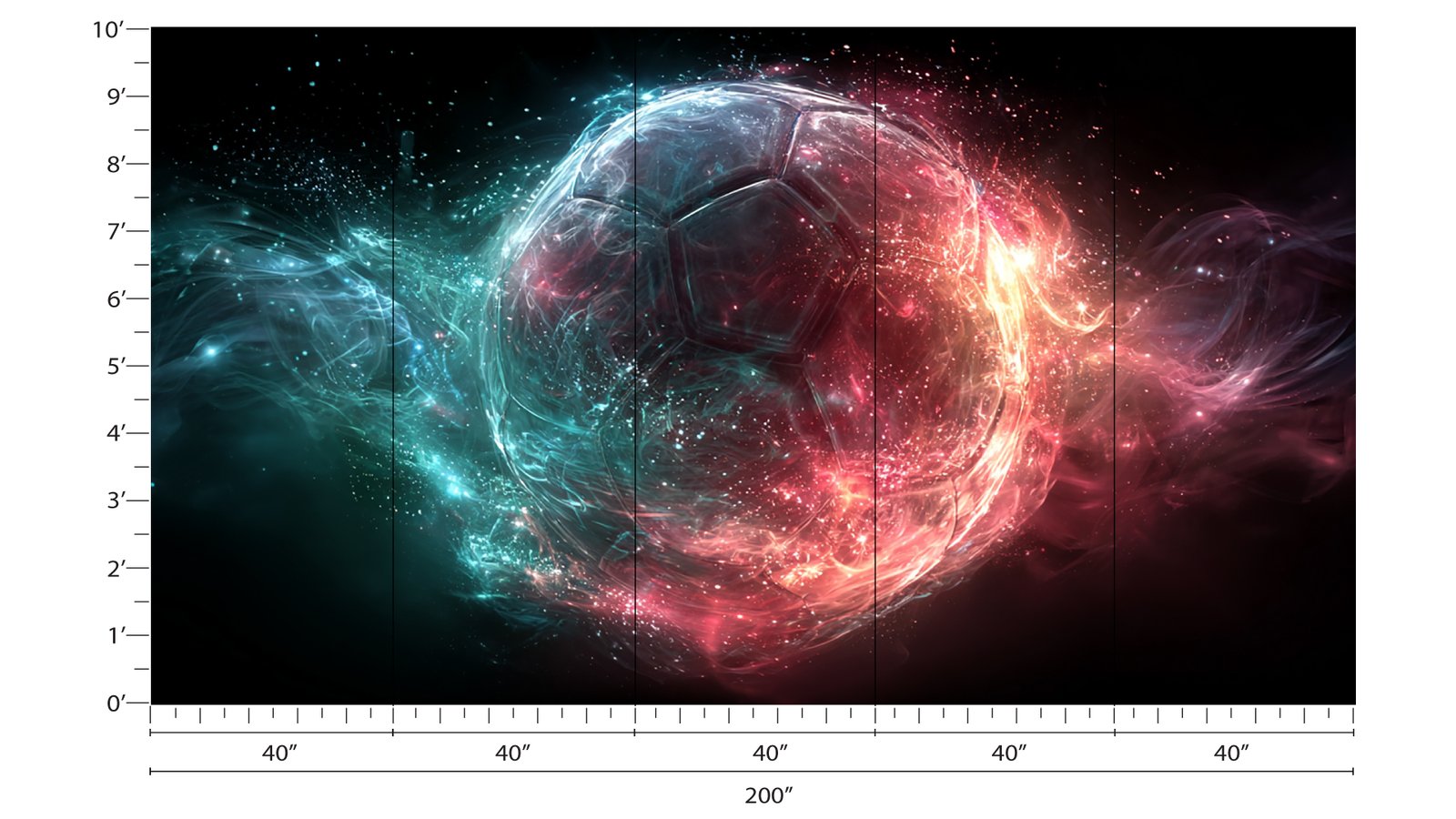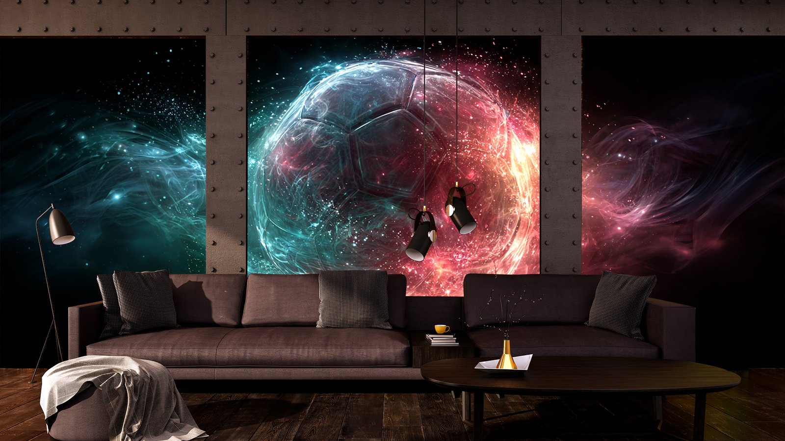 A vibrant soccer ball surrounded by colorful cosmic effects and swirling light patterns