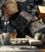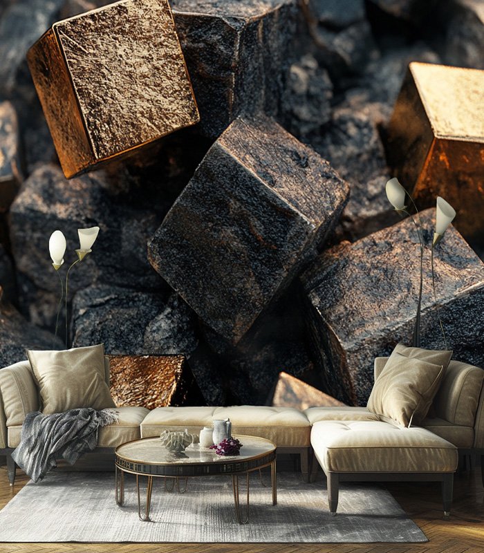 Golden cubes gleam amidst rough, dark stones, creating a striking contrast that symbolizes the hidden treasures and raw beauty found in nature’s depths.