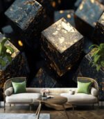 Close-up of textured, metallic cubes with a golden shimmer, creating an abstract and visually captivating pattern of geometric shapes and light reflections.