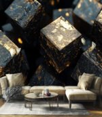 A close-up view of textured, metallic cubes with golden highlights, creating a visually striking pattern of geometric shapes and shimmering surfaces.