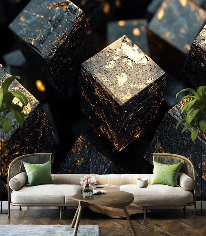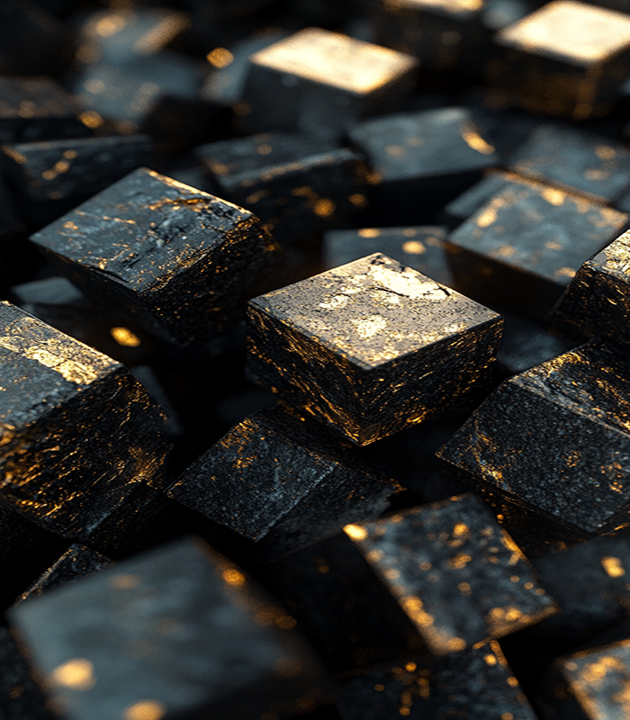 A close-up view of textured, metallic cubes with golden highlights, creating a visually striking pattern of geometric shapes and shimmering surfaces.