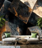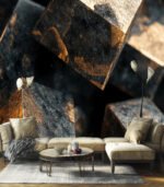Close-up of textured metallic cubes bathed in golden light, showcasing intricate details and shadows that highlight their geometric shapes and rugged surfaces.