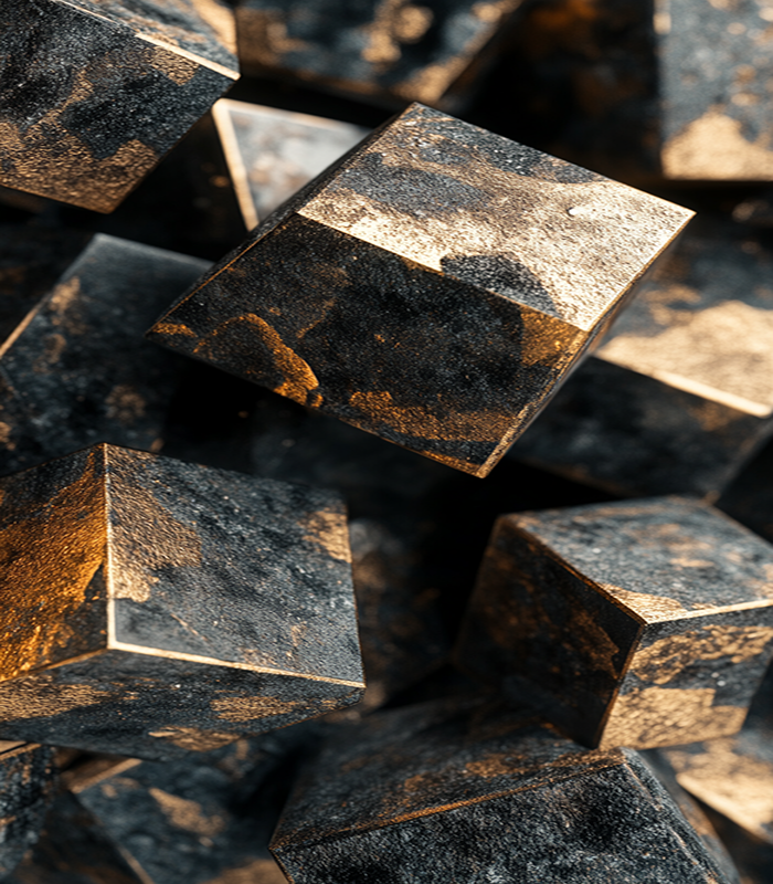 Close-up of textured metallic cubes bathed in golden light, showcasing intricate details and shadows that highlight their geometric shapes and rugged surfaces.