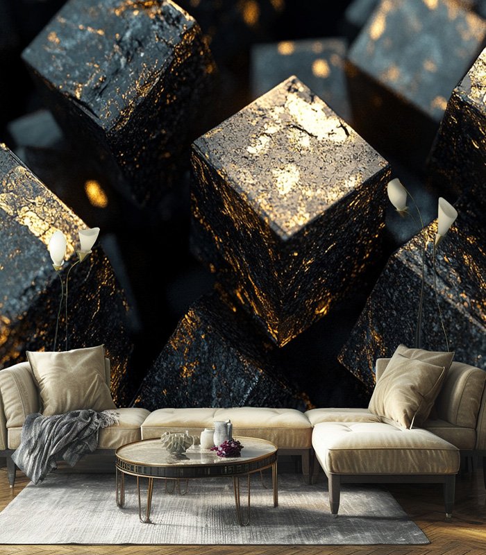Close-up of textured, metallic cubes with a golden shimmer, creating an abstract and visually captivating pattern of geometric shapes and light reflections.