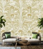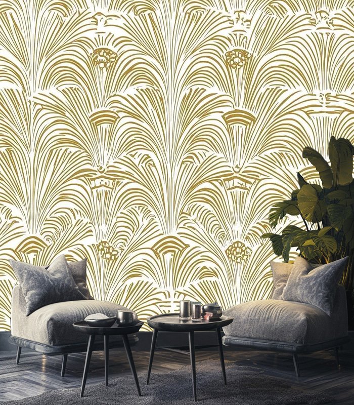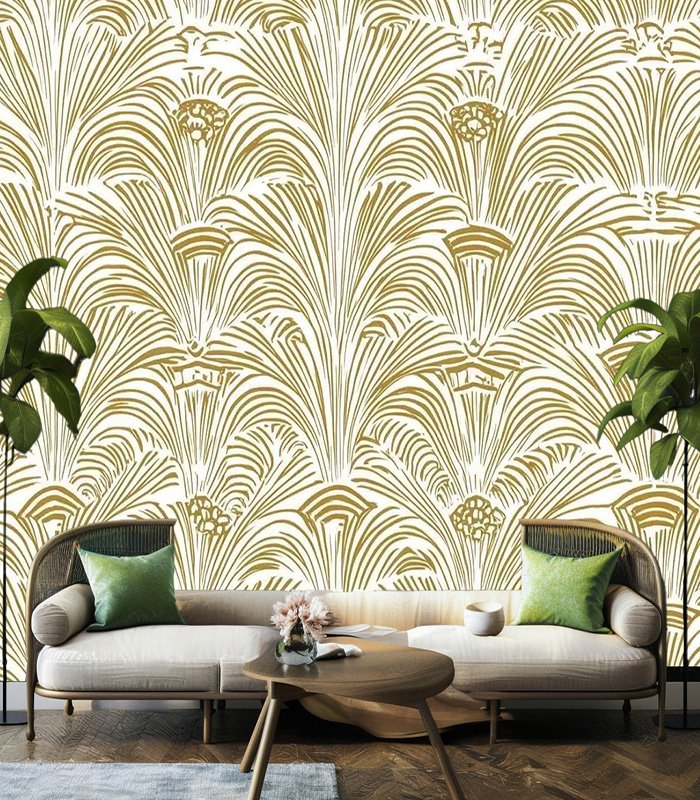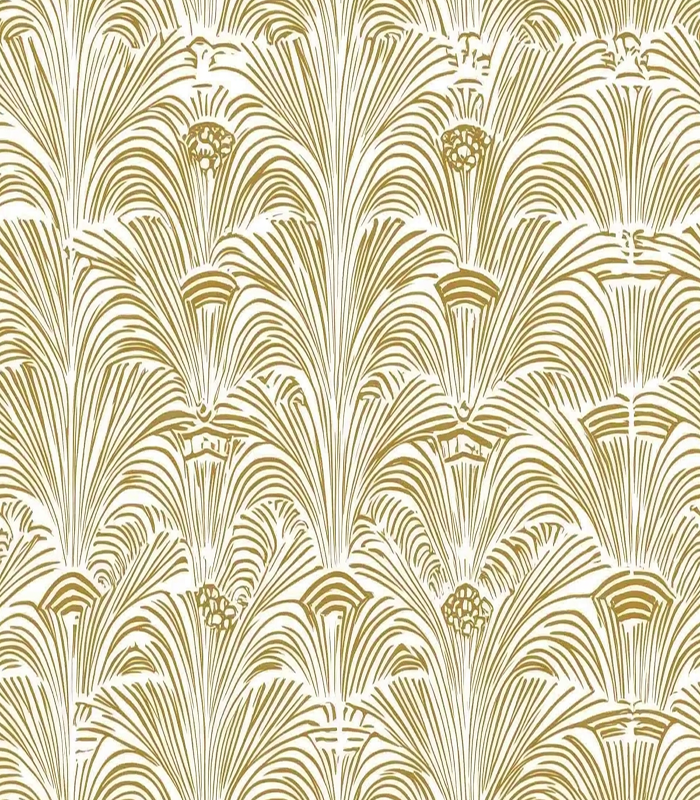 Intricate Art Deco pattern with gold fan-like motifs on a white background, creating an elegant and symmetrical design reminiscent of vintage luxury.