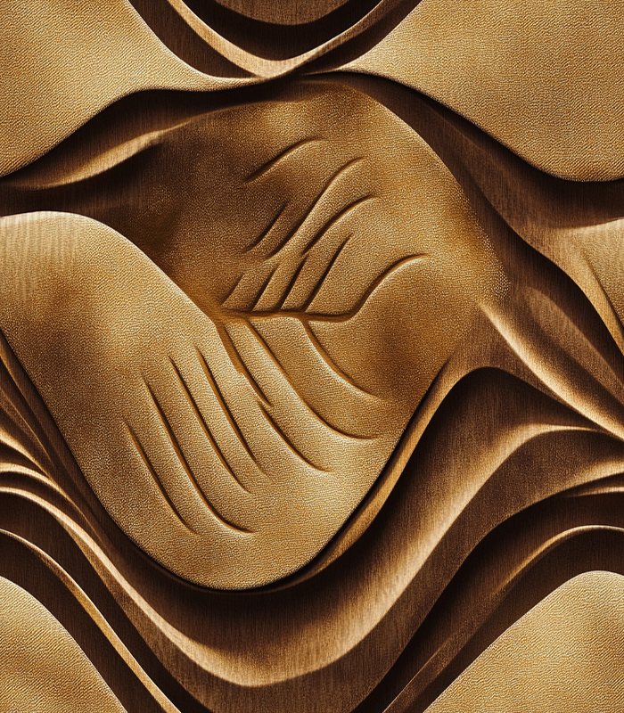 Abstract golden waves create a textured, flowing pattern, resembling sand dunes or fabric folds, with intricate shadows enhancing the three-dimensional effect.