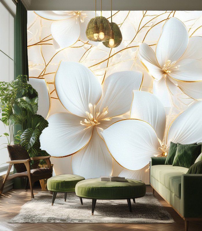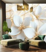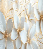 Elegant white flowers with golden accents create a luxurious and serene pattern, blending nature’s beauty with artistic sophistication in a captivating design.