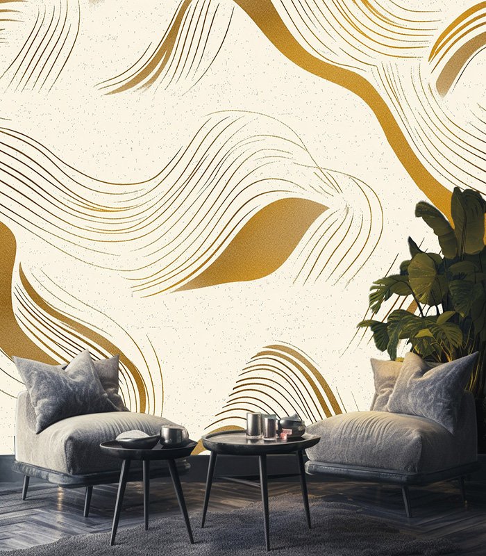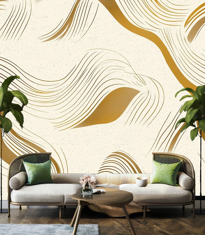Abstract design with flowing golden lines on a textured beige background, creating a sense of movement and elegance. Perfect for modern decor.