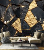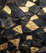 A luxurious pattern of black stones fragmented and joined by golden seams, creating an elegant and rich mosaic texture. A symbol of opulence and artistry.