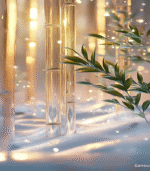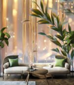 Golden light illuminates a serene bamboo forest, casting a magical glow on the snow-dusted ground, creating a peaceful, enchanting winter wonderland.